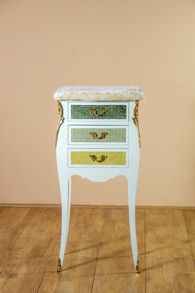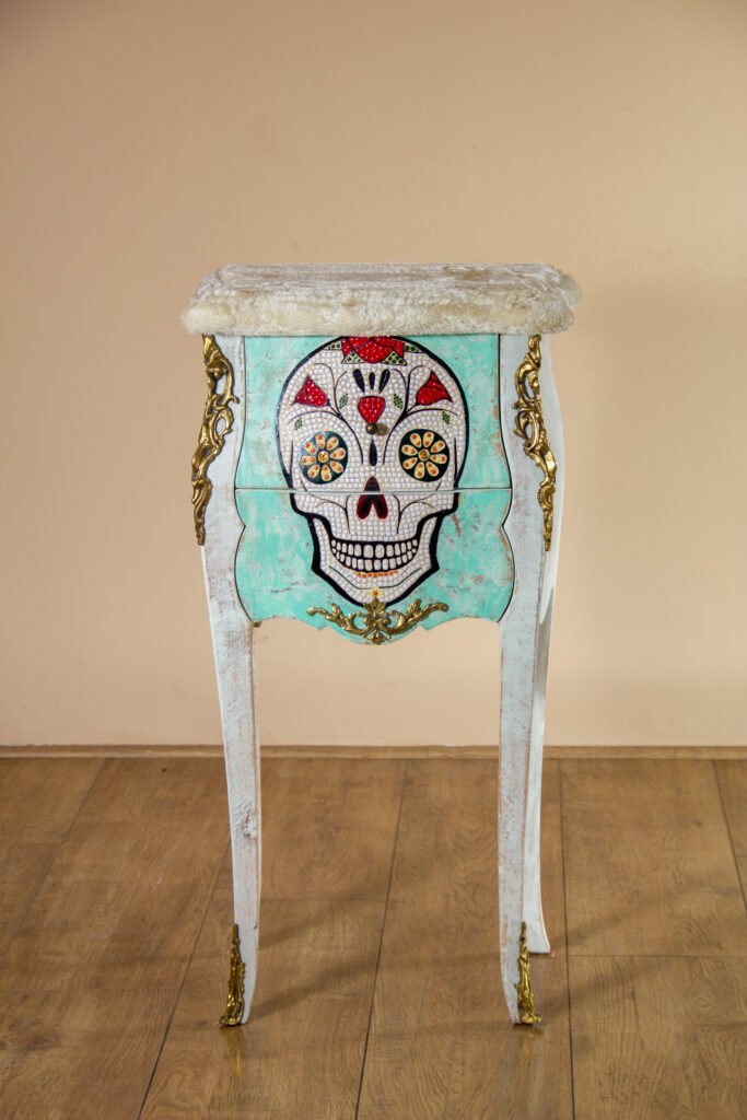 Meubles transformés, détournés et sublimés par le travail de la mosaïque, de la peinture et des finitions artisanales.